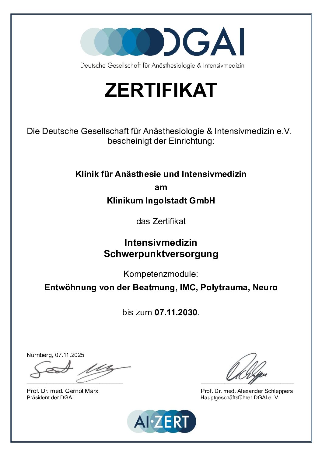 Seit dem 07.11.2025 ist unsere Klinik durch die DGAI mit dem Zertifikat plus AI-ZERT zertifiziert.
