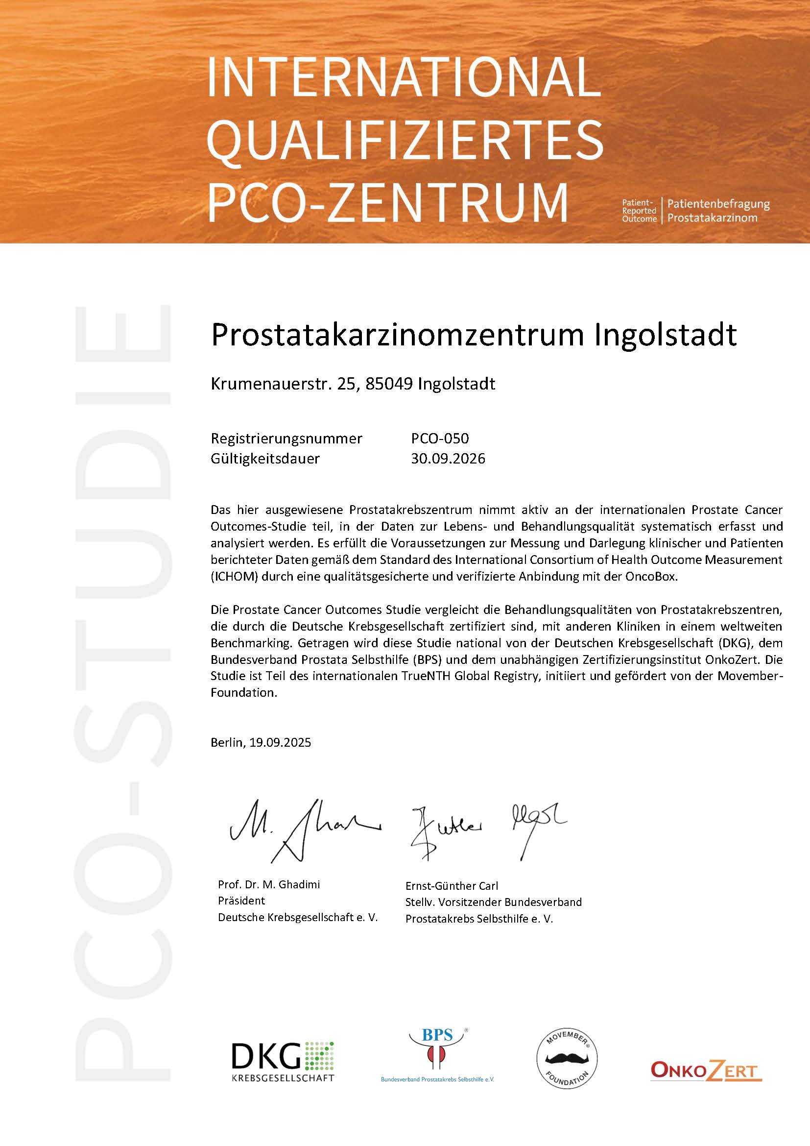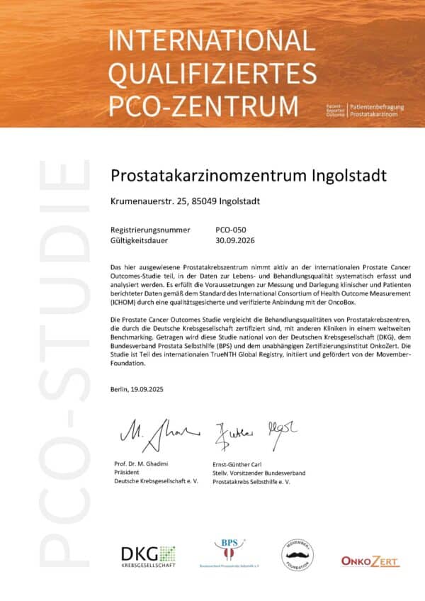 Herr Prof. Dr. Manseck ist Leiter des zertifizierten ProstatakarzinomZentrums Ingolstadt. Alle Behandlungsabläufe wurden unabhängig sowohl vom TÜV Süd als auch von OnkoZert überprüft und werden seither zur Behandlung von Patienten mit Prostatakrebs von der Deutschen Krebsgesellschaft ausdrücklich empfohlen.