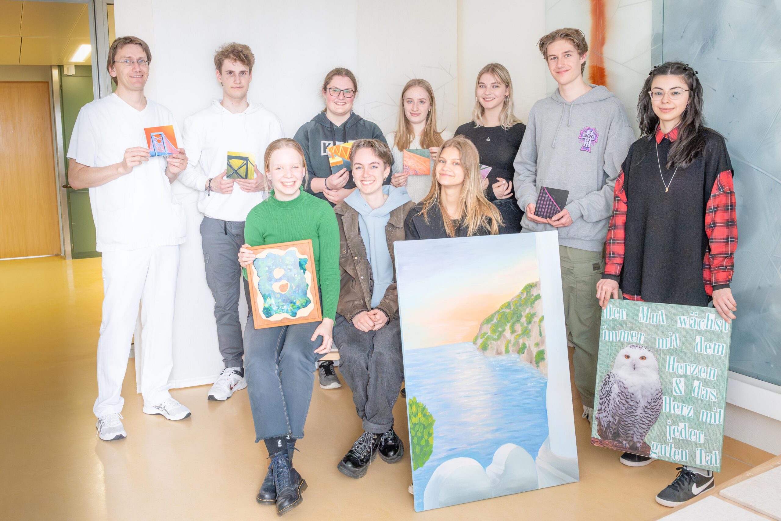 Viele der Kunstwerke greifen die Themen Natur und Leben auf: Eine Brücke, deren Ende man nicht erkennt, ein helles Licht, das den Rest des Bildes überstrahlt, Bäume mit persönlichen Botschaften, das Meer, das an frühere Urlaube erinnert, der Blick in die Ferne, eine Mauer, hinter der sich das Paradies befindet. „Die Schüler*innen des Q12-Kunstadditums haben sich im Vorfeld sehr viele Gedanken zu den Themen Krankheit und Tod, Leben und Hoffnung gemacht und sich der Aufgabe gestellt, hier in einen Kommunikationsprozess zu treten und in ihren Werken aufzugreifen“, erzählt Björn Keidel, Leiter des Additums. Dazu haben die Schüler*innen auch eine Führung durch die Station bekommen und durften sich einen Eindruck verschaffen. „In der Wahl ihrer künstlichen Mittel waren die Schüler*innen sehr frei.“
