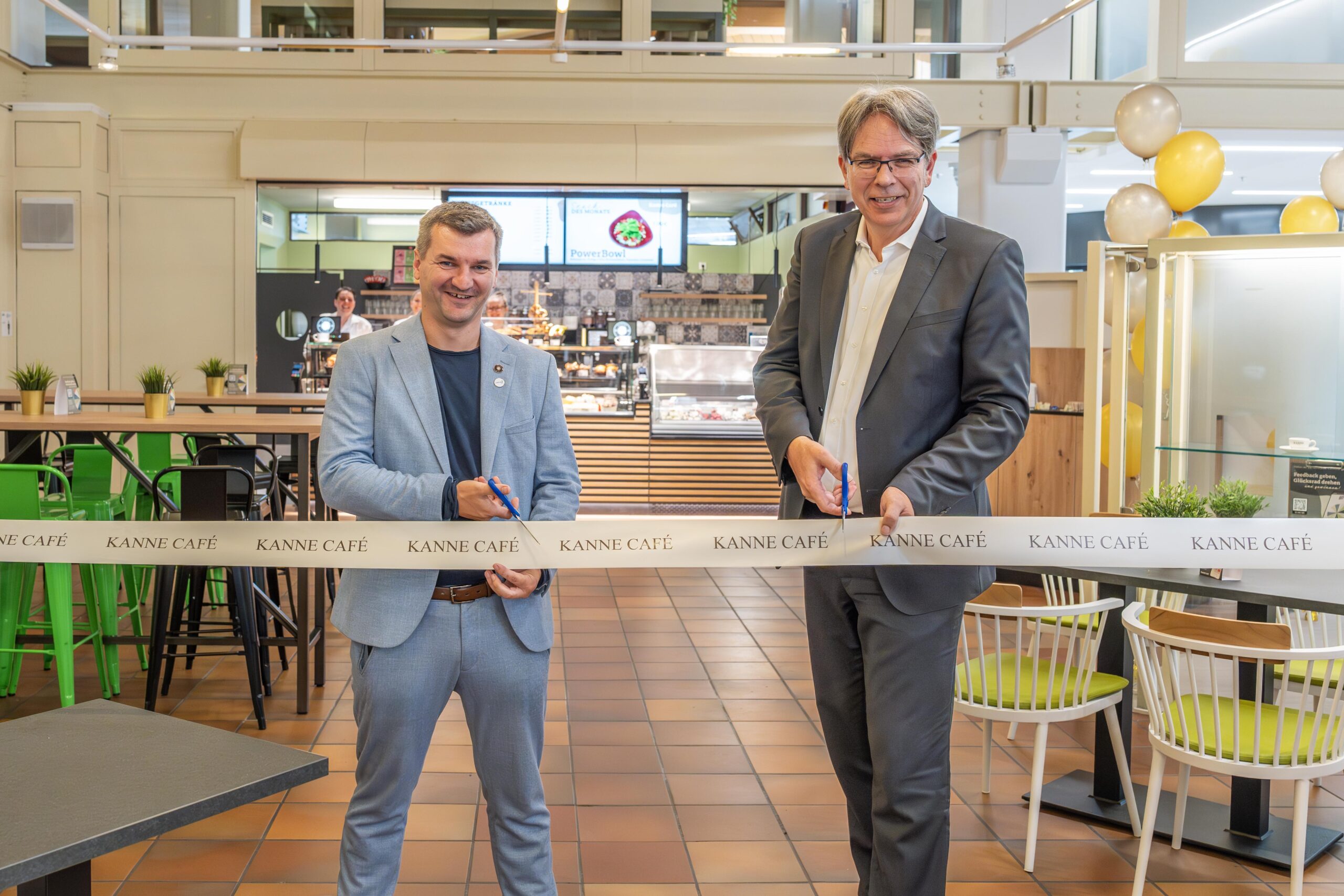 Seit heute gibt es im Klinikum Ingolstadt wieder ein Café für Patient*innen und ihre Angehörigen. Jochen Bocklet, Geschäftsführer Finanzen und Infrastruktur, Personal und Berufsbildungszentrum Gesundheit am Klinikum Ingolstadt und Chris Hausner, Head of Operations des Kanne Cafés, eröffnen das neue Café feierlich.