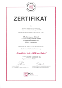 Die Chest Pain Unit wird regelmäßig einem komplexen Zertifizierungsverfahren durch entsprechende Fach-und Prüfungsgesellschaften unterzogen. Unabhängige Experten, unter anderem von der Deutschen Gesellschaft für Kardiologie (DGK), überprüfen die Einrichtung nach einem strengen Kriterienkatalog auf ihre Qualität und Leistungsfähigkeit und haben der interdisziplinären Versorgungseinrichtung erneut exzellente Qualität bescheinigt.