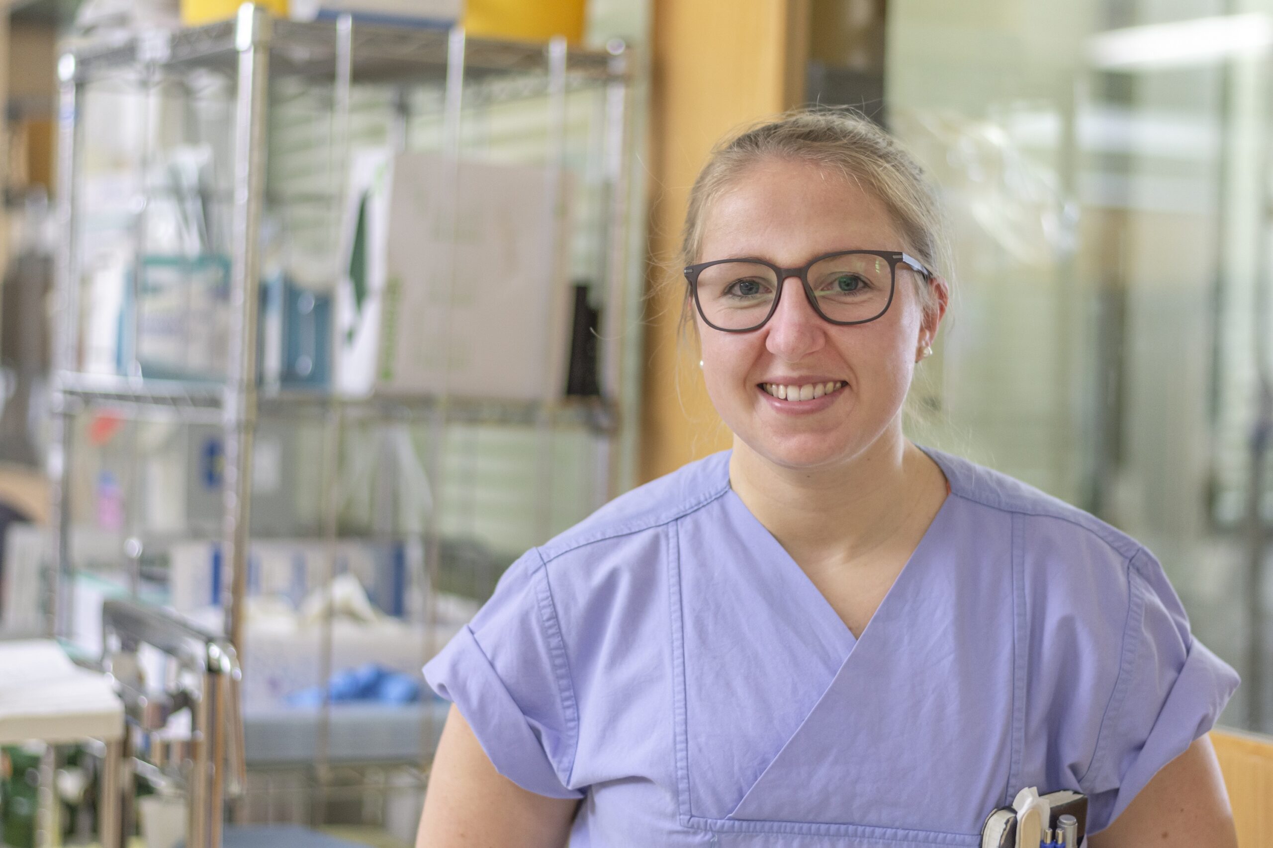 Die Versorgung der Covid-19-Patienten ist wegen der persönlichen Schutzausrüstung deutlich aufwändiger als bei anderen Patienten. „Ich kann nicht einfach mal schnell aus dem Patientenzimmer gehen, um für den Patienten Wasser zu holen. Ich bin vermummt und darf mit meiner Kleidung nichts außerhalb des Isolationszimmers anfassen,“ berichtet Lisa Brucklacher, stellvertretende Stationsleiterin, über die Arbeit auf der Corona-Intensivstation. „Das Schicksal dieser Patientinnen und Patienten geht uns allen sehr, sehr nahe. An einem Tag sprechen Sie noch mit einem Patienten, der große Angst hat. Am nächsten Tag ist er intubiert. Und dann geht es ihm plötzlich so schlecht, dass er es vielleicht nicht überlebt. Die Patienten, die es nach langer Behandlung dann doch schaffen, sind für mein Team der große Ansporn.“