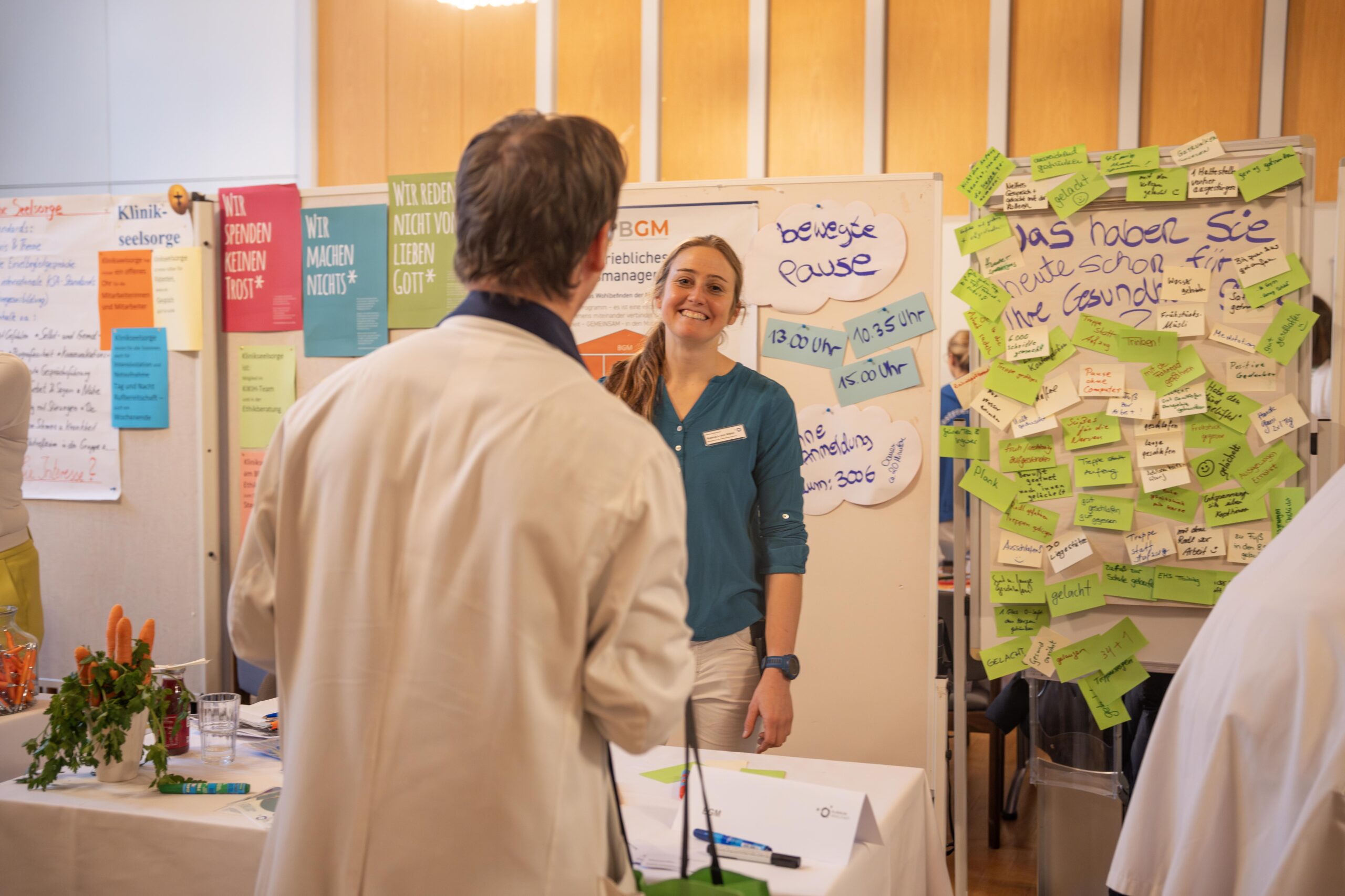 An zahlreichen Ständen informierten Fachabteilungen des Klinikums zur Schwerbehindertenvertretung, zur KlinikumsInternen KrisenInterventionsHilfe (KIKIH), zur Arbeitssicherheit, zur Seelsorge und zur Diätassistenz . Darüber hinaus hielten die Ärztinnen und Ärzte des Klinikums Vorträge zu Freizeitsport, Krankheitsbildern der Hand und zu kardiovaskulären Risikofaktoren.