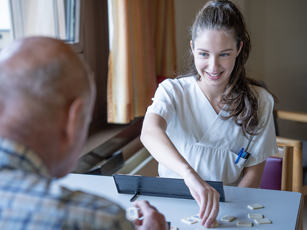 Neben grundsätzlichen Tätigkeiten der Pflege, wie die Vitalwerte messen oder bei der Körperhygiene und Dokumentation zu unterstützen, hilft sie auf „ihrer Station“ – wie sie es selbst sagt, zum Beispiel auch dabei, Drogenscreenings auszuwerten und verbringt viel Zeit mit den Patienten/-innen. „Der persönliche Kontakt ist in der Psychiatrie besonders wichtig“, erklärt die 19-Jährige. „Wir gehen oft spazieren, unterhalten uns, machen Brettspiele und kleinere Aktivierungsrunden. Manchmal gehe ich auch für die Patienten/-innen einkaufen oder wir kochen gemeinsam.“ Sie erfahre für ihre Arbeit sehr viel Dankbarkeit, sowohl von den Kolleginnen und Kollegen in der Pflege, die durch ihre Unterstützung bei alltäglichen Aufgaben entlastet werden, als auch von den Patienten/-innen selbst. „Oft reicht ein 10-minütiges Gespräch – und es kommt so viel Dankbarkeit zurück.“