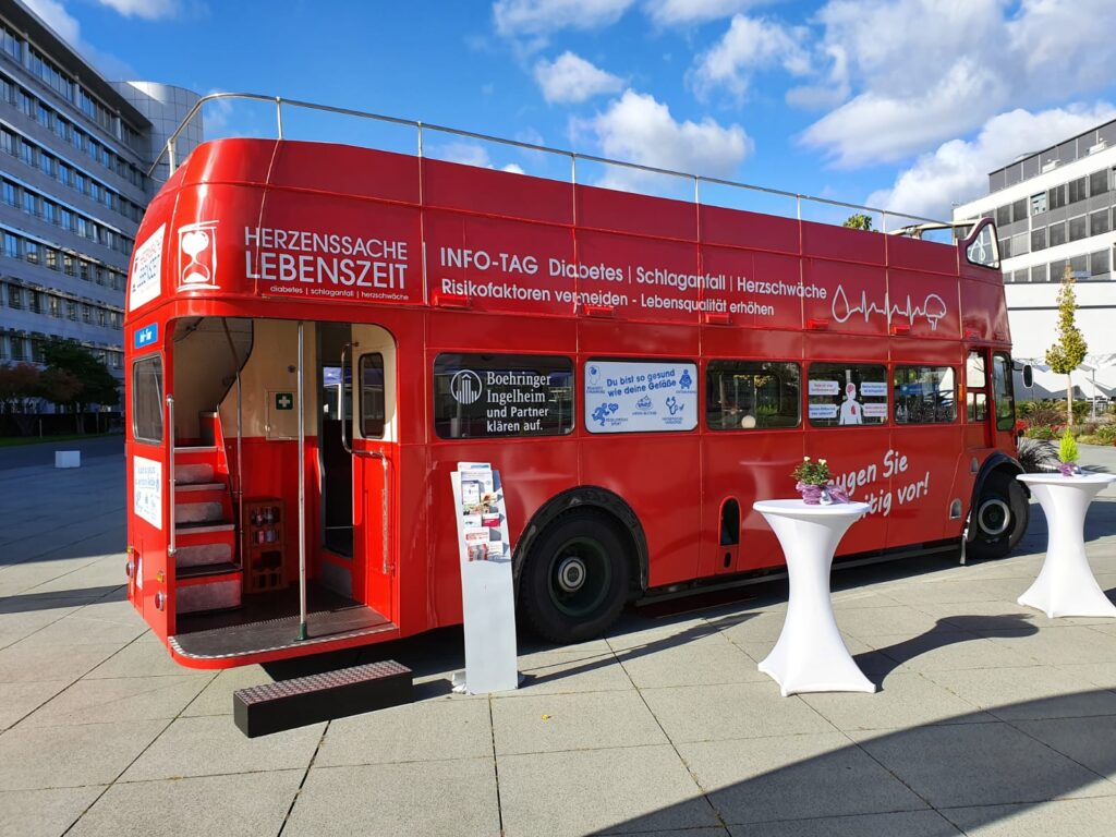 Im signalroten Infobus der Initiative „Herzenssache Lebenszeit“ erklärt er, gemeinsam mit seinem Team und den Experten/-innen der Klinik für Neurologie und der Klinik für Nephrologie, was jeder selbst für die eigene Gesundheit tun kann, welche Lebensgewohnheiten man besser ablegen sollte und wie man im Ernstfall richtig reagiert.