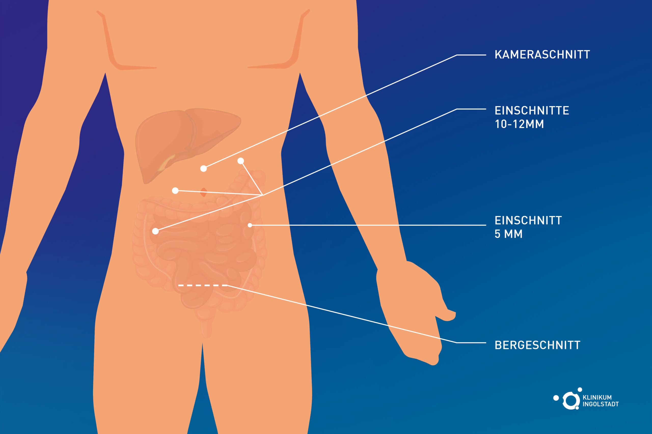 Erst danach entfernen die Ärzte den betroffenen Abschnitt des Enddarms. Je nach Ausbreitung des Tumors kommt auch der den Darm umgebende Fett- und Bindegewebskörper mit den darin liegenden Lymphknoten hinzu. Der Chirurg durchtrennt das Gewebe mit Instrumenten, die lediglich 5 mm Durchmesser besitzen, und versiegelt das Gewebe durch Strom oder Ultraschall, bevor die eigentliche Gewebedurchtrennung erfolgt. Die Bergung des Präparates muss dann über eine Vergrößerung eines Zugangs auf ca. 5 – 8 cm an einer kosmetisch günstig gelegenen Stelle erfolgen.