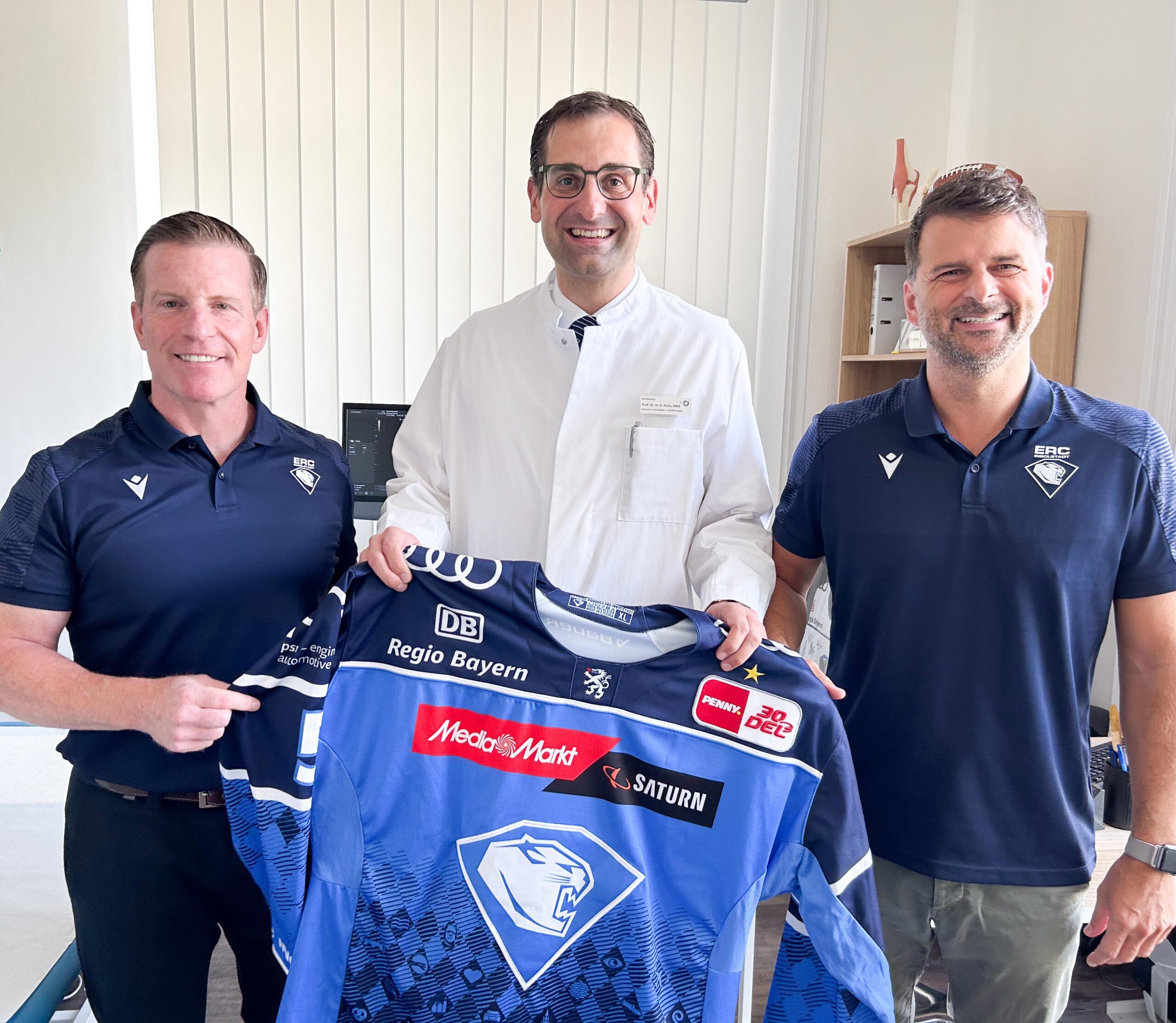 Medizinisch in den besten Händen: Wenn Eishockey-Profis ärztliche Unterstützung benötigen, hilft der medizinische Stab des ERC Ingolstadt mit seinen Netzwerkärzten. Seit Kurzem gibt es dort ein neues Gesicht: Prof. Hans-Georg Palm (M.), der Direktor des Zentrums für Orthopädie und Unfallchirurgie im Klinikum Ingolstadt. „Am liebsten sind wir präventiv tätig, aber wenn es nötig sein sollte, helfen wir mit unserer chirurgischen Expertise als eines der großen unfallchirurgischen Zentren in Süddeutschland“. Zur Übergabe eines Originaltrikots mit den Unterschriften der ERC-Spieler trafen sich ERC-Sportdirektor Tim Regan (l.), Prof. Hans-Georg Palm, und Stephan Ehler, Ärztlicher Leiter und Teamarzt des ERC sowie Leiter des Zentrums für Sportmedizin im Klinikum Ingolstadt.